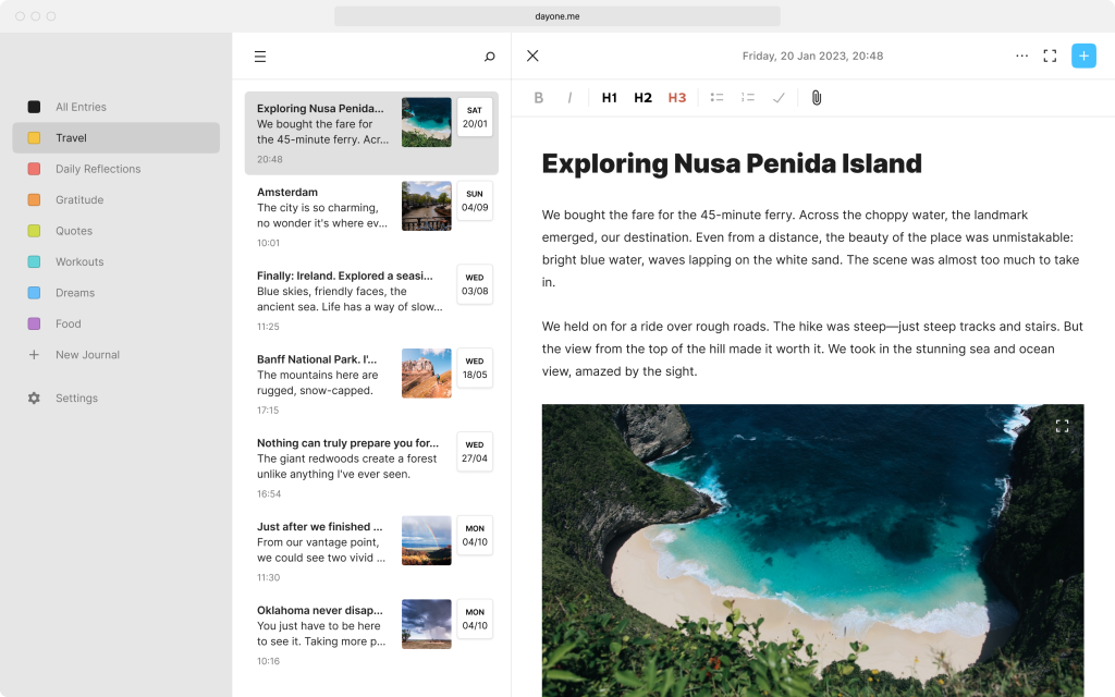 One key feature of Day One is its ability to sync across multiple devices using its free cloud service. This ensures you can access your journals anytime, whether you’re on your Mac, iPhone, or iPad. It also supports passcode protection to keep your entries private.