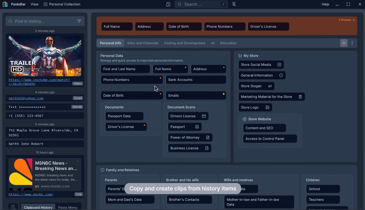 This is where Pastebar really shines. You can organize your clips into collections, tabs, and boards. For example, I have a collection for personal info (like addresses, emails and phone numbers for me and my family), another for coding snippets, and even one for my favorite websites and channels. Each collection can hold text, images, or documents, making it easy to keep everything in one place. - Handles Images Too!