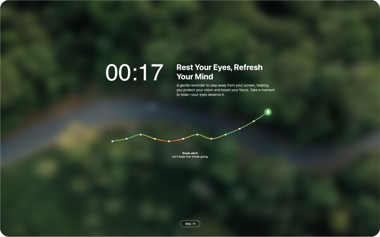 - Gentle posture and blink reminders
